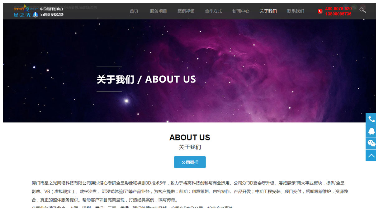 厦门市星之光网络科技有限公司通过潜心专研全息影像和裸眼3D技术5年,致力于将高科技创新与商业运用。公司分“3D宴会厅升级、展览展示”两大事业板块,提供“全息影像、VR(虚拟现实)、数字沙盘 、沉浸式体验厅”等产品业务...