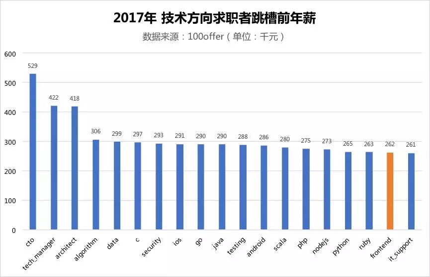 虽然在求职人数上,前端方向是千军万马争渡的热门岗位;但如果拿求职者们的当前薪资进行横向比较,前端求职者在 2017 年的薪资表现相对一般,与 Python、Ruby 工程师的水平相近。