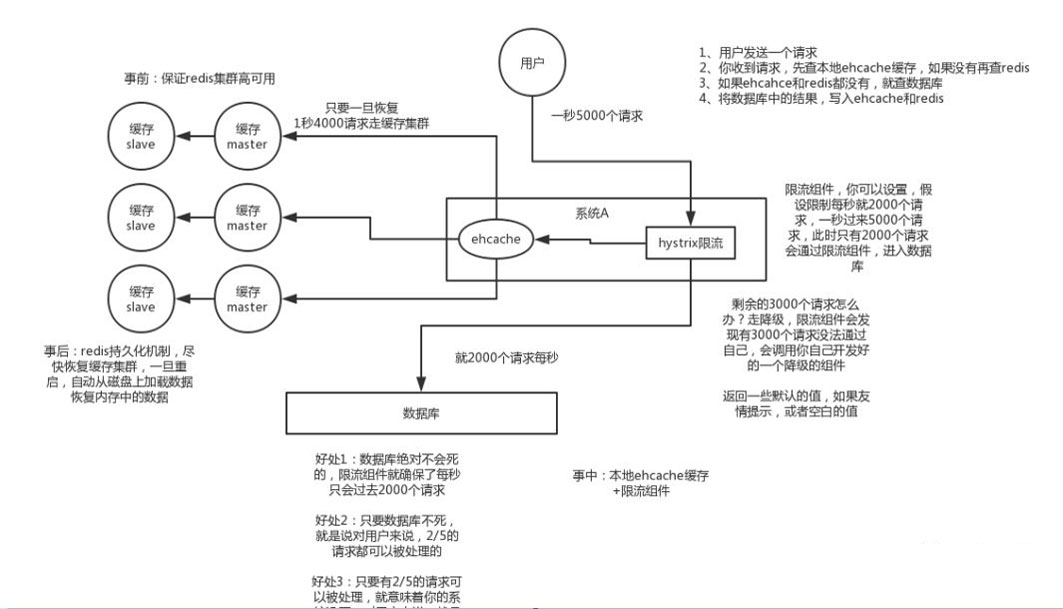 这种方案就是在发生雪崩前对缓存集群实现高可用,如果是使用 Redis,可以使用 主从+哨兵 ,Redis Cluster 来避免 Redis 全盘崩溃的情况。
